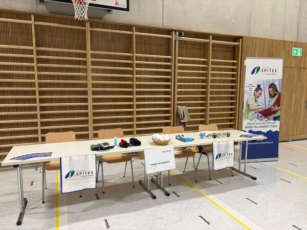 Am 17. Januar 2026 war die Spitex Zimmerberg AG am Berufswahlmarkt in der Sekundarschule Thalwil (Schulanlage Feld) vertreten. Von 09.00 bis 12.00 Uhr informierten unsere Fachverantwortliche Berufsbildung Pflege, eine Praxisausbildnerin sowie Lernende über Ausbildungsmöglichkeiten in der Pflege und gaben praxisnahe Einblicke in den Spitex-Alltag.